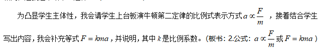 【設(shè)計意圖:讓學生上臺板演牛頓第二定律的表達式,可以鍛煉學生從概念中提取公式的能力,通過我的引導以及學生的獨立思考,可以加強學生對公式的理解能力。】