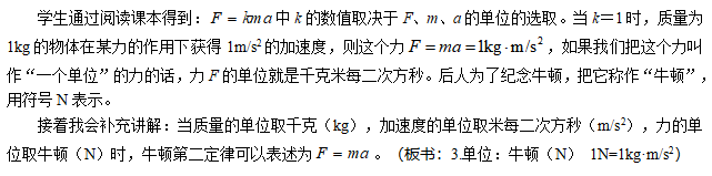 因為這部分知識和初中所學聯(lián)系密切,我會首先引導學生復習初中學習過的力的單位,即在國際單位制中,力的單位是牛頓(N)。并提出問題:那“牛頓”這個單位是怎樣定義的?