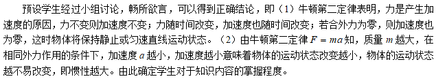 在此部分,我會組織學生小組討論,我會出示兩個問題:(1)由牛頓第二定律,分析力與加速度之間的關(guān)系?合外力為零時,物體是怎樣的狀態(tài)?(2)用牛頓第二定律解釋,為什么說質(zhì)量是物體慣性大小的標志?