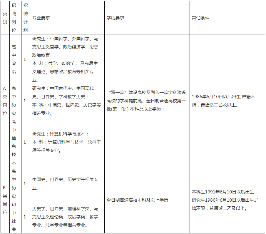 本次擬面向社會公開招聘A類崗位為緊缺專業(yè)人才3名,具體崗位為高中政治、高中歷史、高中信息技術各1名;B類崗位為下屬中學教師2名,具體崗位為高中歷史、初中社會各1名。具體見下表:
