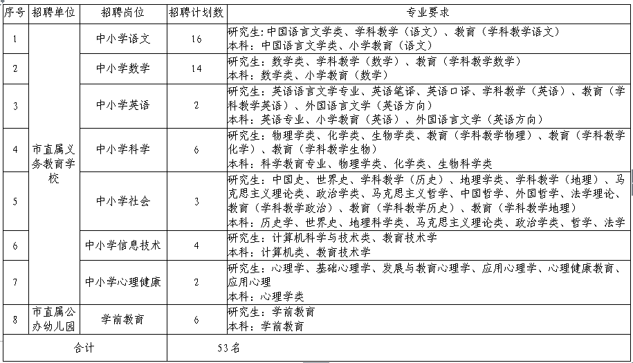 本次面向社會公開招聘市直屬義務教育學校和公辦幼兒園教師53人,招聘計劃見附件1。